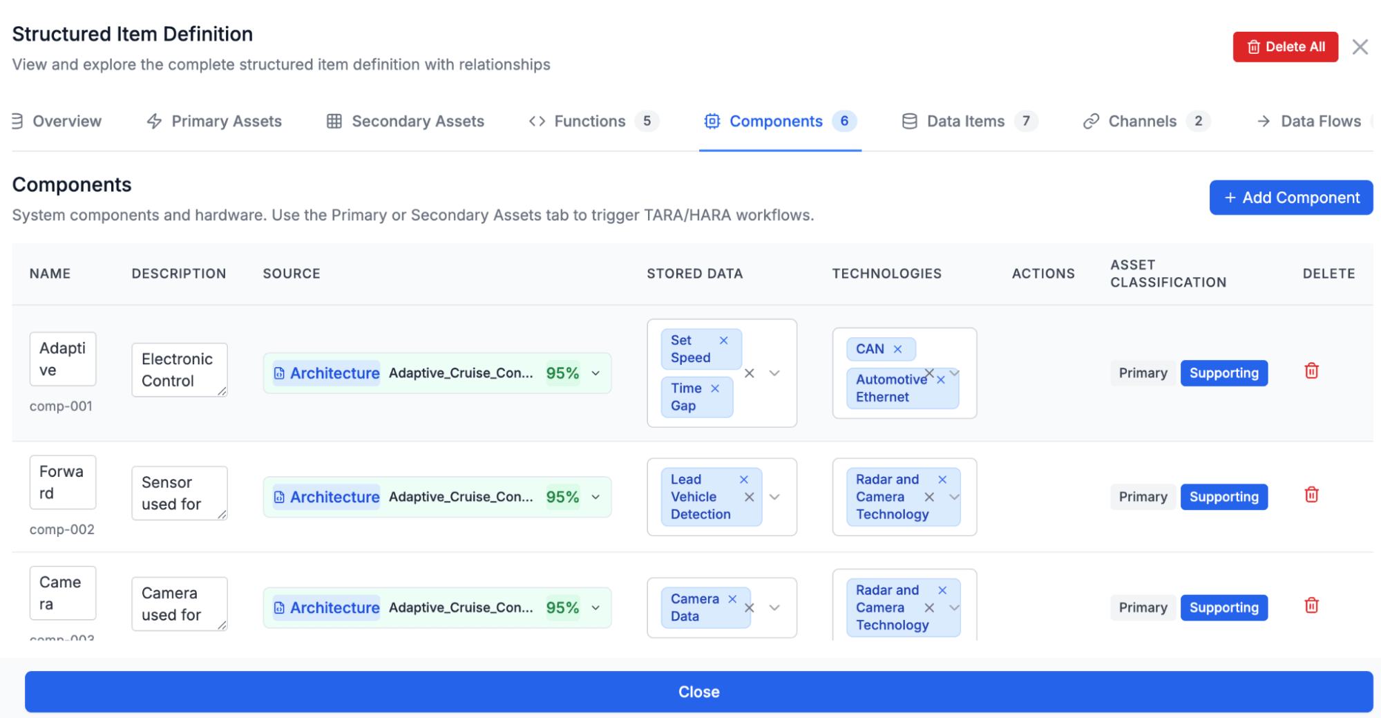 Interface details that matter in practice—such as interface type (CAN, Ethernet, Bluetooth) and internal vs external exposure—are explicitly captured, because they directly affect attack feasibility and attack paths.